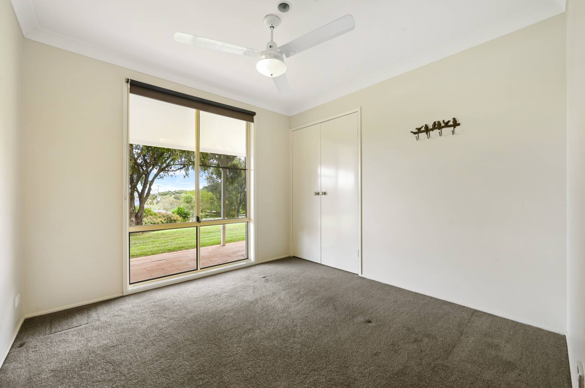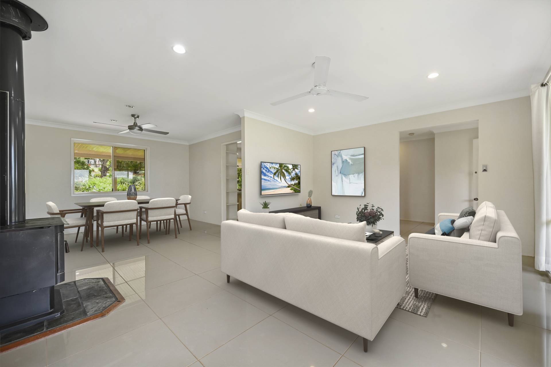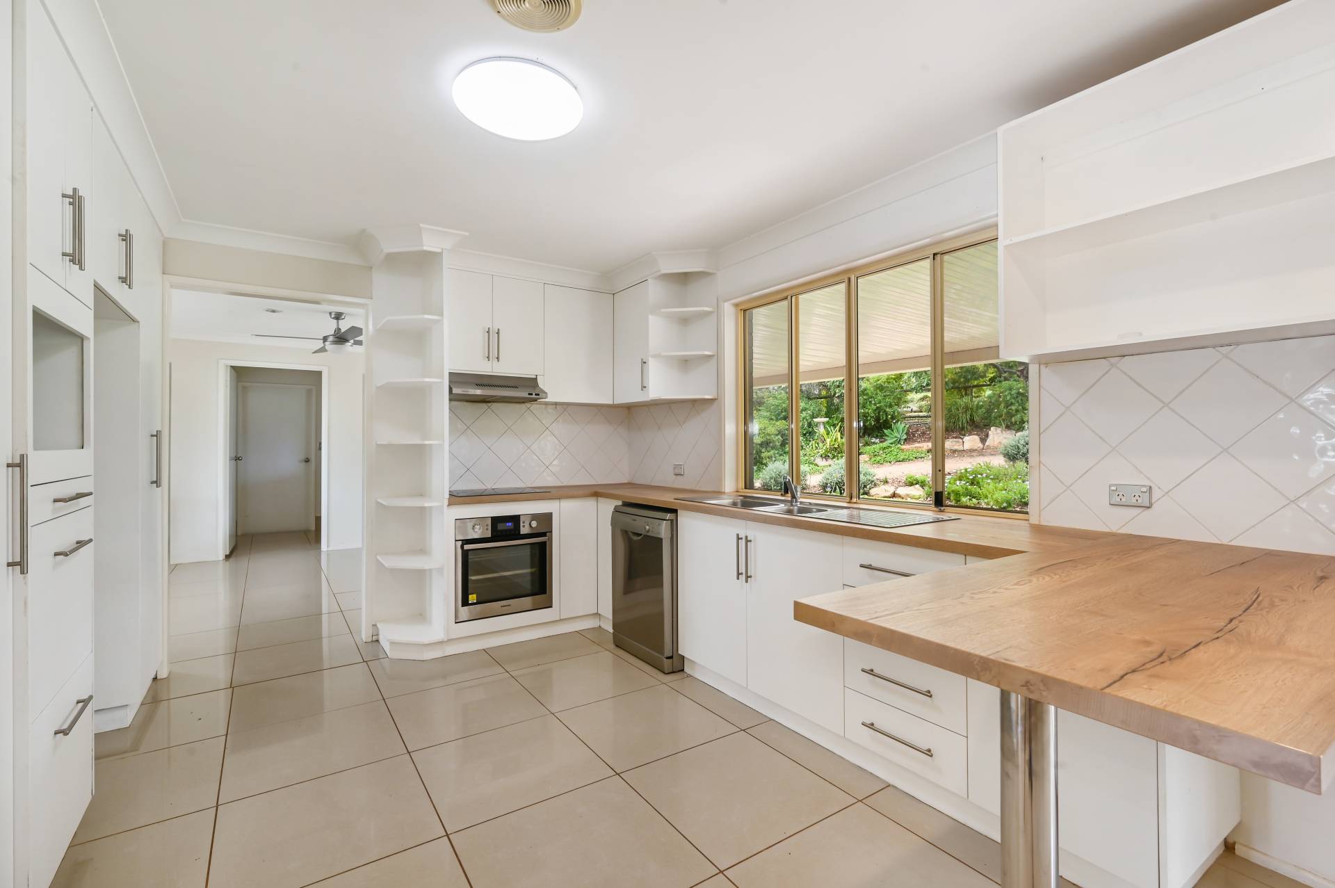 Set on an impressive elevated landscaped 1-acre block, this spacious family home has 3 good-sized bedrooms and a smaller 4th bedroom, nursery or office. All bedrooms have built-in cupboards, ceiling fans and the air-conditioned main bedroom with recent ensuite (walk-in shower, vanity and toilet).