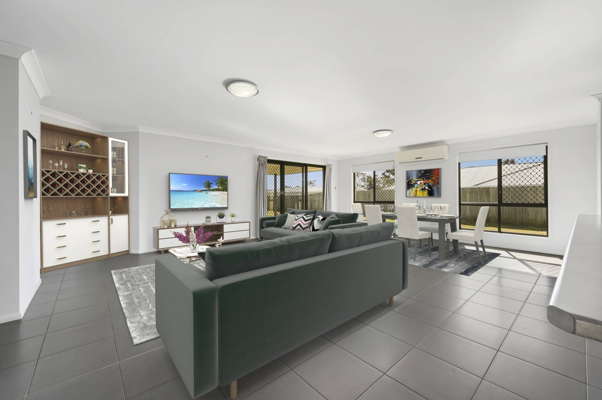 The air-conditioned tiled living/dining area offers several layout options and has an abundance of natural light from the large North facing windows and glass sliding doors that lead to the covered outdoor entertaining space that overlooks the sizeable rear yard.