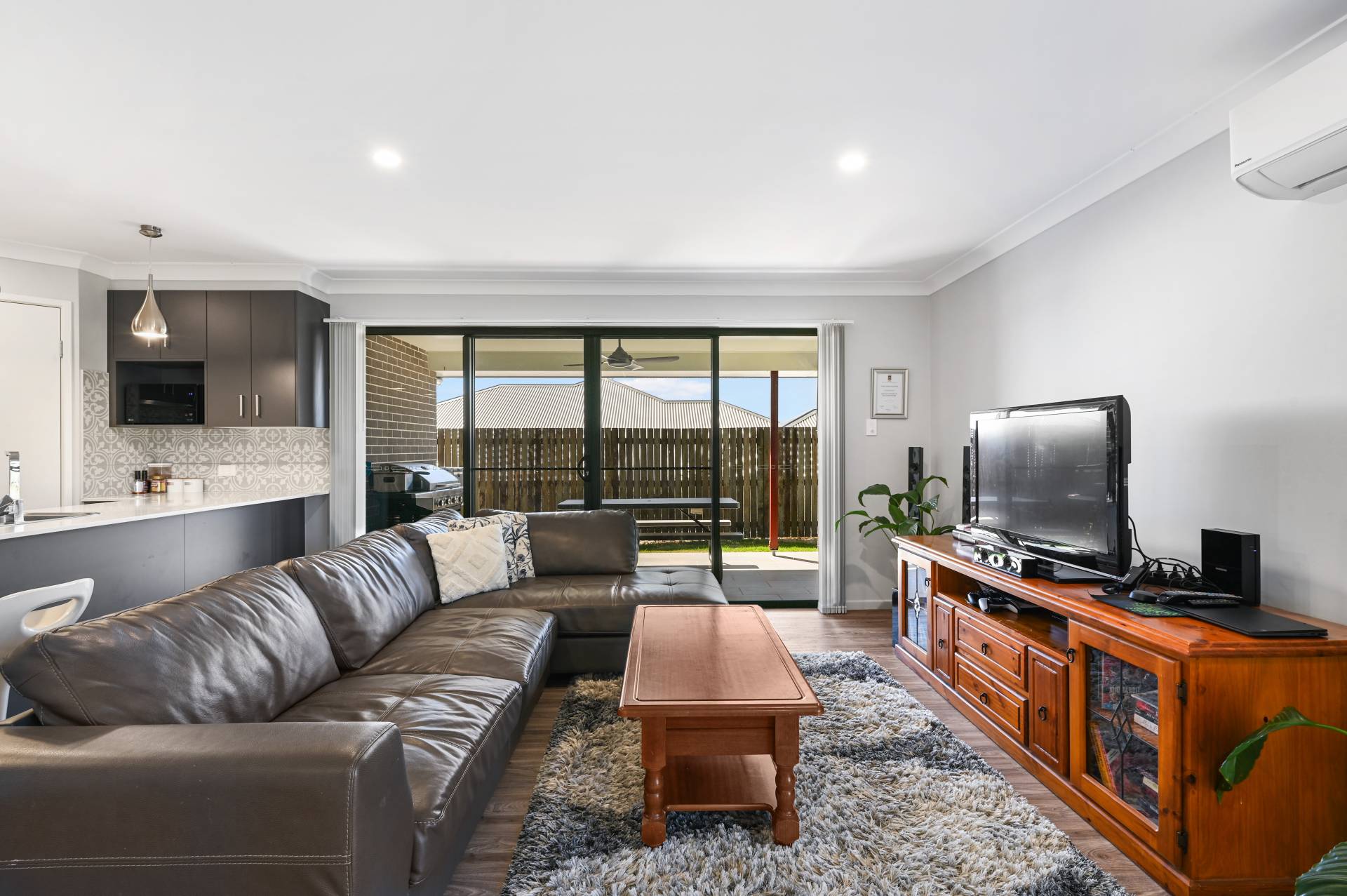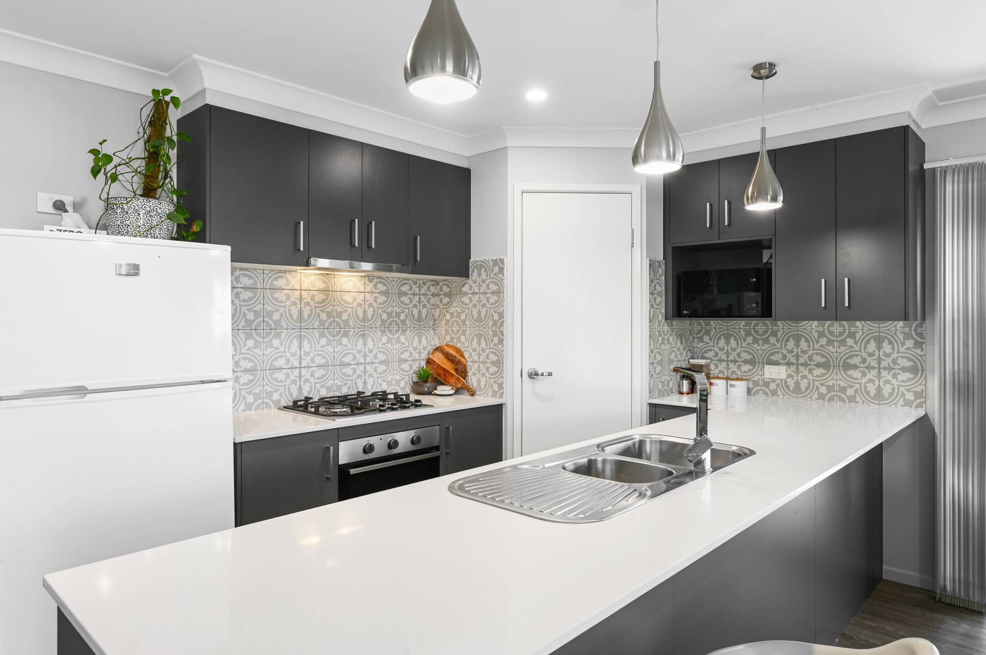The kitchen is part of an open-plan kitchen/dining/lounge area with access to the north facing covered outdoor entertaining space. It has a gas cook-top (LPG), dishwasher, double-bowl sink, corner pantry and large sit-up bench perfect for food prep and entertaining.