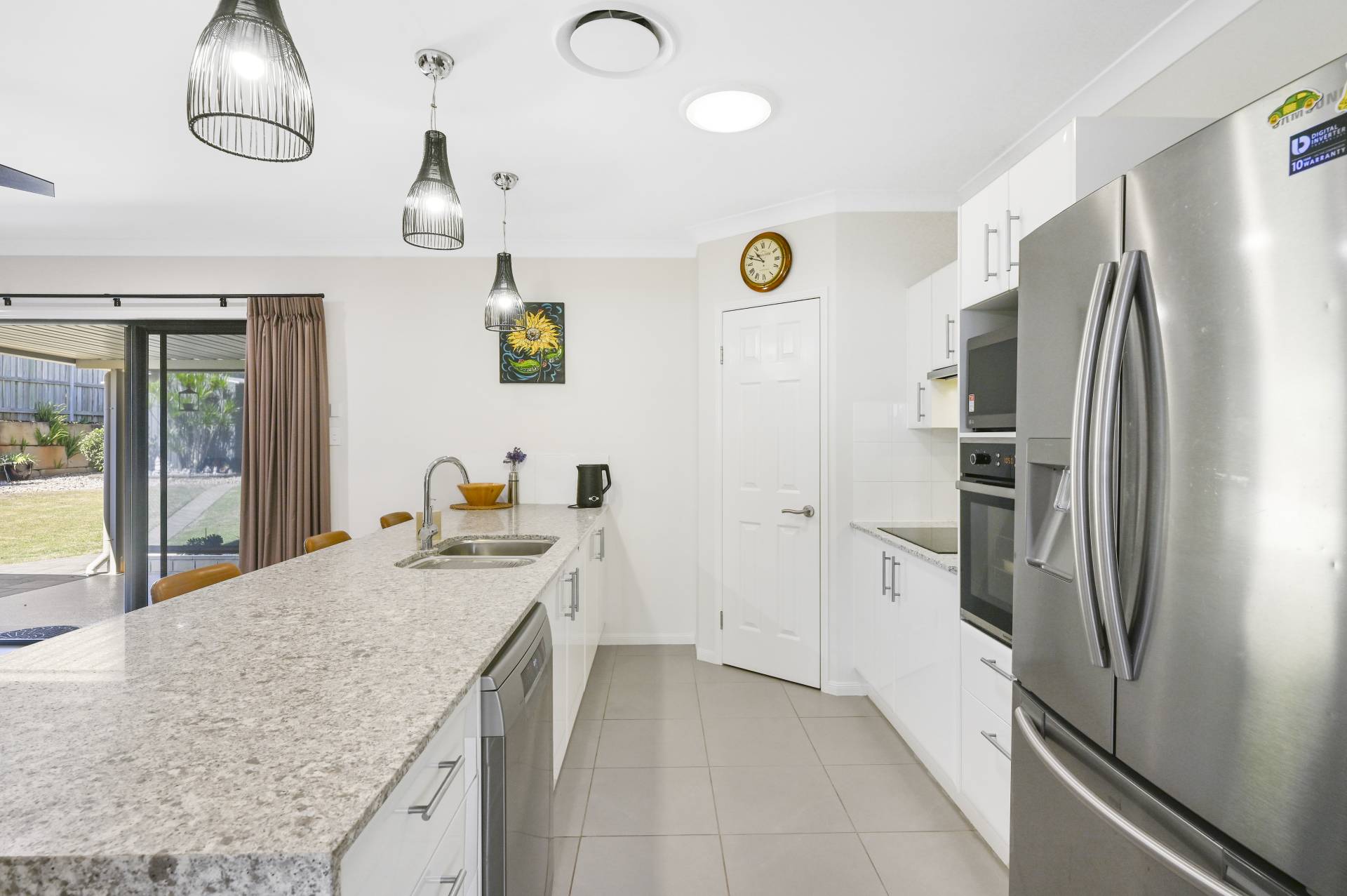 The galley-style kitchen contains quality appliances, including an electric cook-top and wall oven, near-new dishwasher and large fridge cavity. The over-size island bench (3.6m) with waterfall stone top makes for a great prep area and room to seat up to 6 people as a breakfast bar. The remaining living and dining area is large enough for a 6-8 seat dining table and space for a sideboard or storage with access to the outdoor dining/living space via the large glass sliding doors.