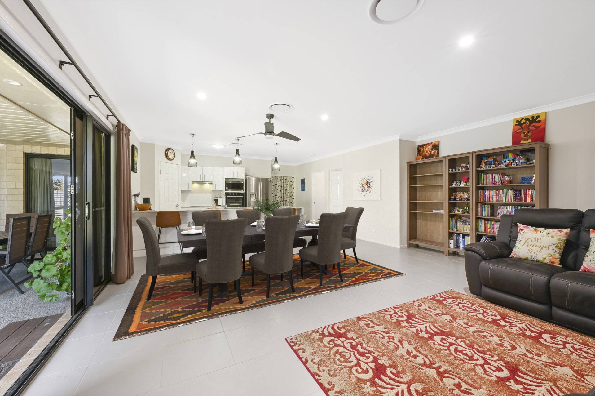 Continuing along the hallway and past the internal access to the double remote garage (with storage) you pass a large linen cupboard and enter the open-plan kitchen, dining and living section of the home, centrally located and also with access to the outdoor dining space.