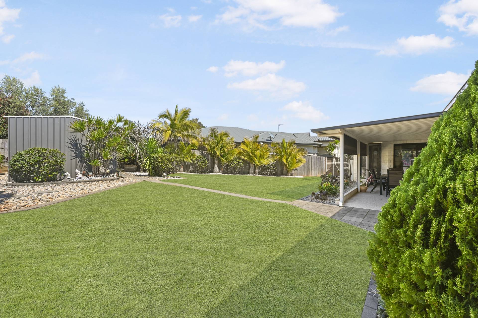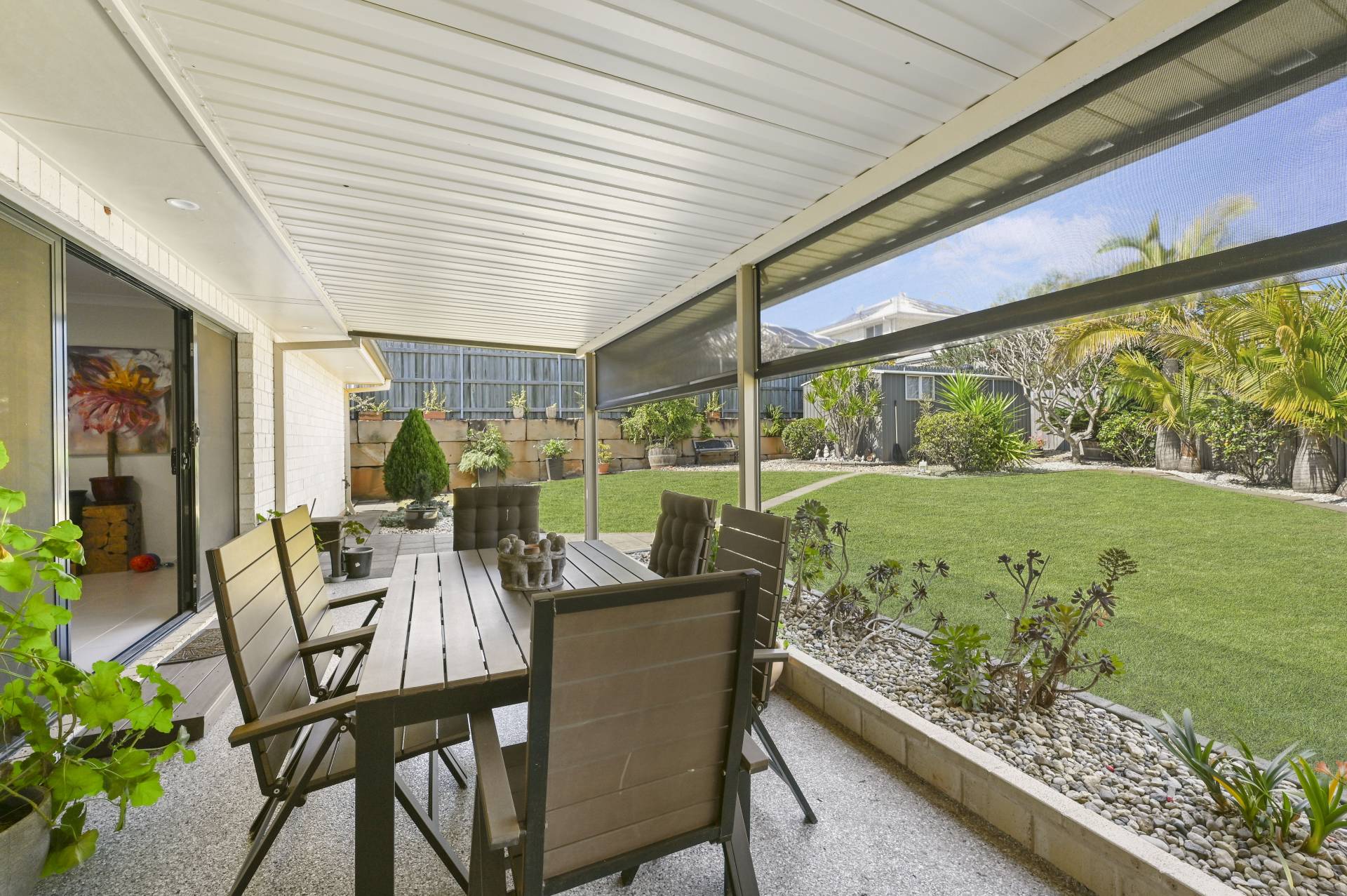 The covered outdoor dining and living space is large enough for a dining and lounge setting with retractable blinds for year-round use and overlooks the well-established landscaped gardens and lawn. There is a 5.3m x 3m garden shed plus an additional smaller lawn locker and 3 x 3000 litre rainwater tanks plumbed to the house (laundry, toilets and outside tap).  The 630m2 landscaped low-maintenance yard is fully fenced and well designed for easy maintenance.
